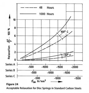 No gráfico, você pode ver facilmente a influência mínima do tempo em comparação com a grande influência que não devemos deixar de considerar que tem a temperatura no processo que nos interessa. Esses valores correspondem a testes reais em peças de aço padrão. Para materiais especiais para altas temperaturas não são conhecidos valores reais, mas podemos garantir que, dependendo do material, podemos obter valores de relaxação menores que os do aço na mesma temperatura e no mesmo nível de compressão. Para saber mais sobre nossas molas de discos, em termos de sua operação e do padrão Din 2093, é possível expandir as informações em: